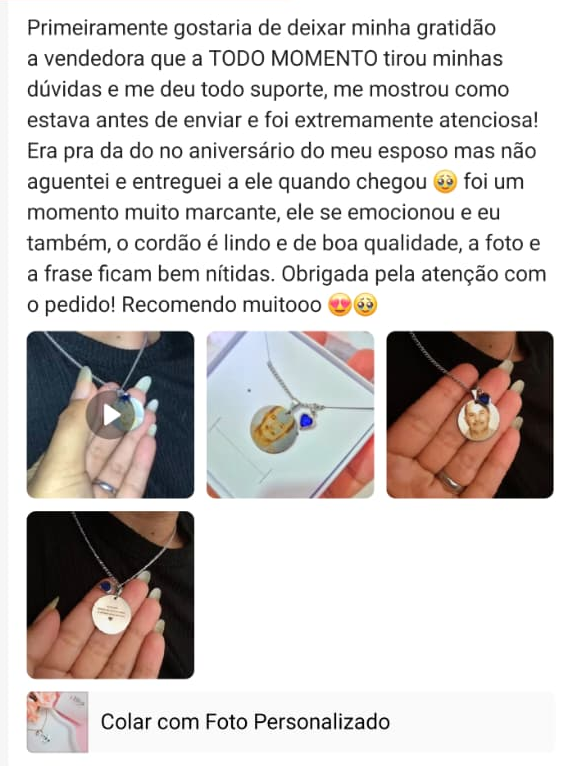 Queremos que você dê asas a sua imaginação, e se estiver um pouquinho dificil de imaginar, pode nos chamar no botão do WhatsApp. Com certeza vamos te ajudar a pensar em uma ideia, e eternizaremos um sorriso, uma foto, uma lembrança, uma música, uma voz, ou quem sabe até um vídeo no seu colar.